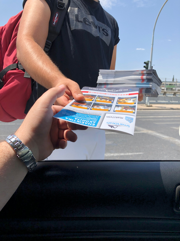 Οι διανεμητές-τριες φέρουν ειδικά γιλέκα ασφαλείας και διανέμουν το έντυπό σας σε διερχόμενους οδηγούς την ώρα που αυτοί παραμένουν ακινητοποιημένοι στο σηματοδότη.